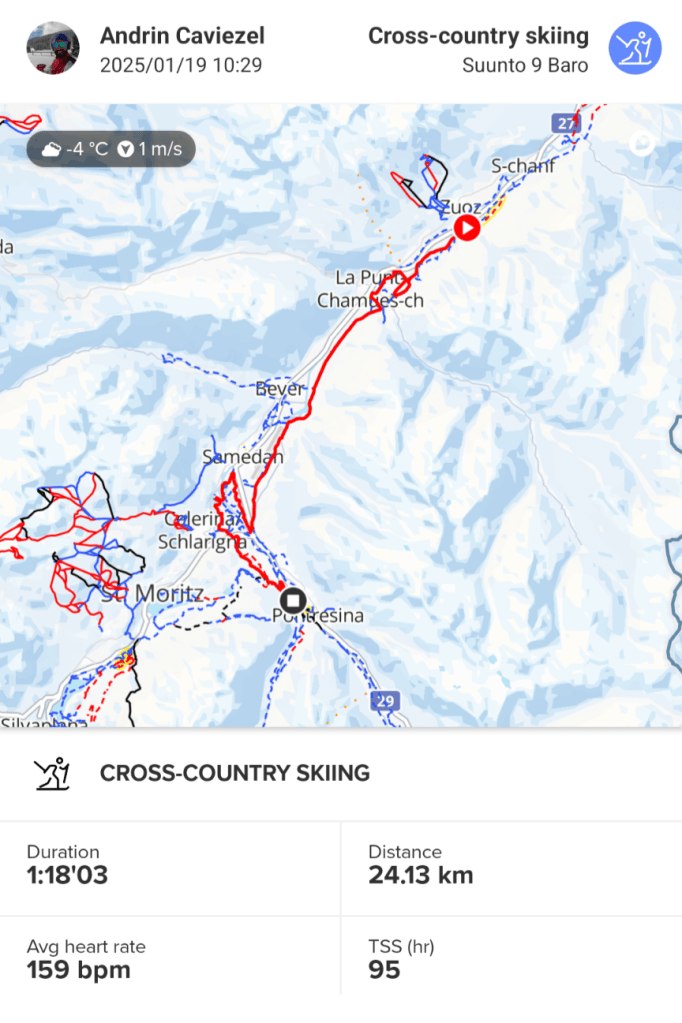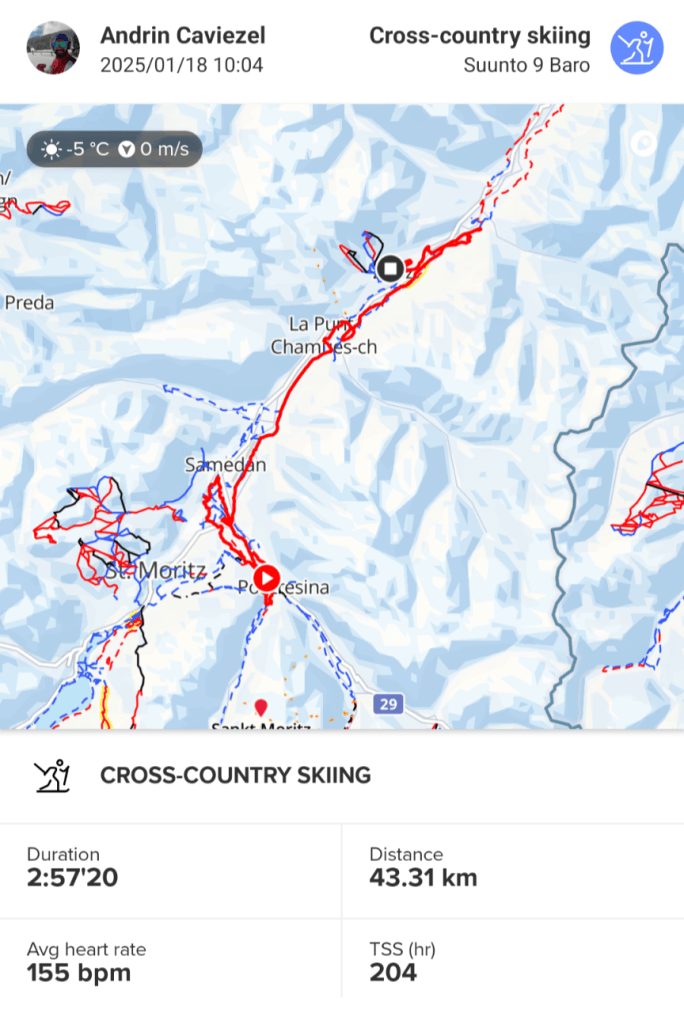 Saturday dawned with La Diagonela, a „shortened“ 43 km race—shortened because apparently even the snow thought it deserved a holiday. But hey, what’s a little missing snow when you’re double-poling your way through the Engadin? Double-poling for nearly three hours felt like the world’s coldest swimming session: arms burning, heart racing, and legs politely reminding me, “We’re here too, you know.” If endurance is about mental toughness, I’d like to think I’m on track for SWISSMAN—if only the swim leg involves a couple of ski poles and a frozen lake.